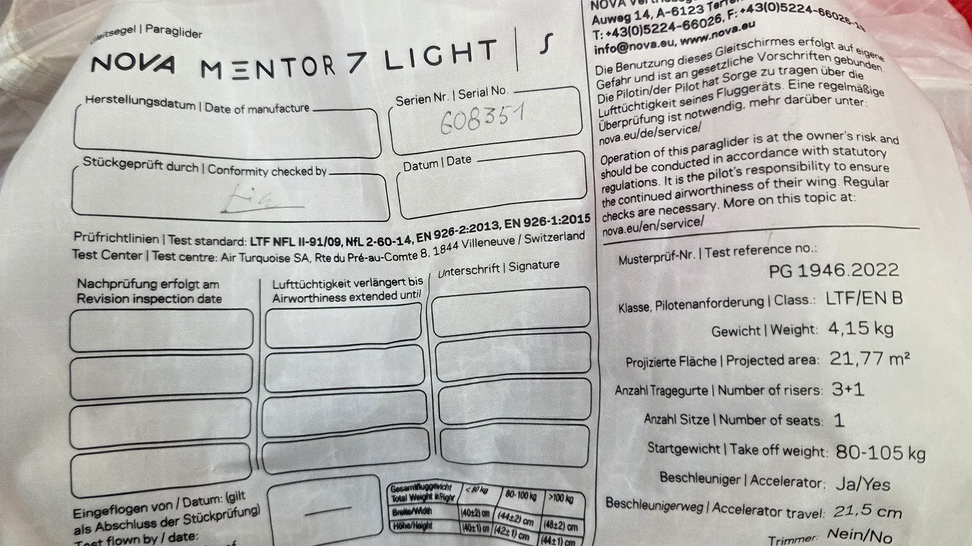 Det er oppgitt at vingens linesett er brukt i 3 timer, har en forventet restlevetid på 247 timer. Nytt linesett til denne vingen koster 5.500,00.
