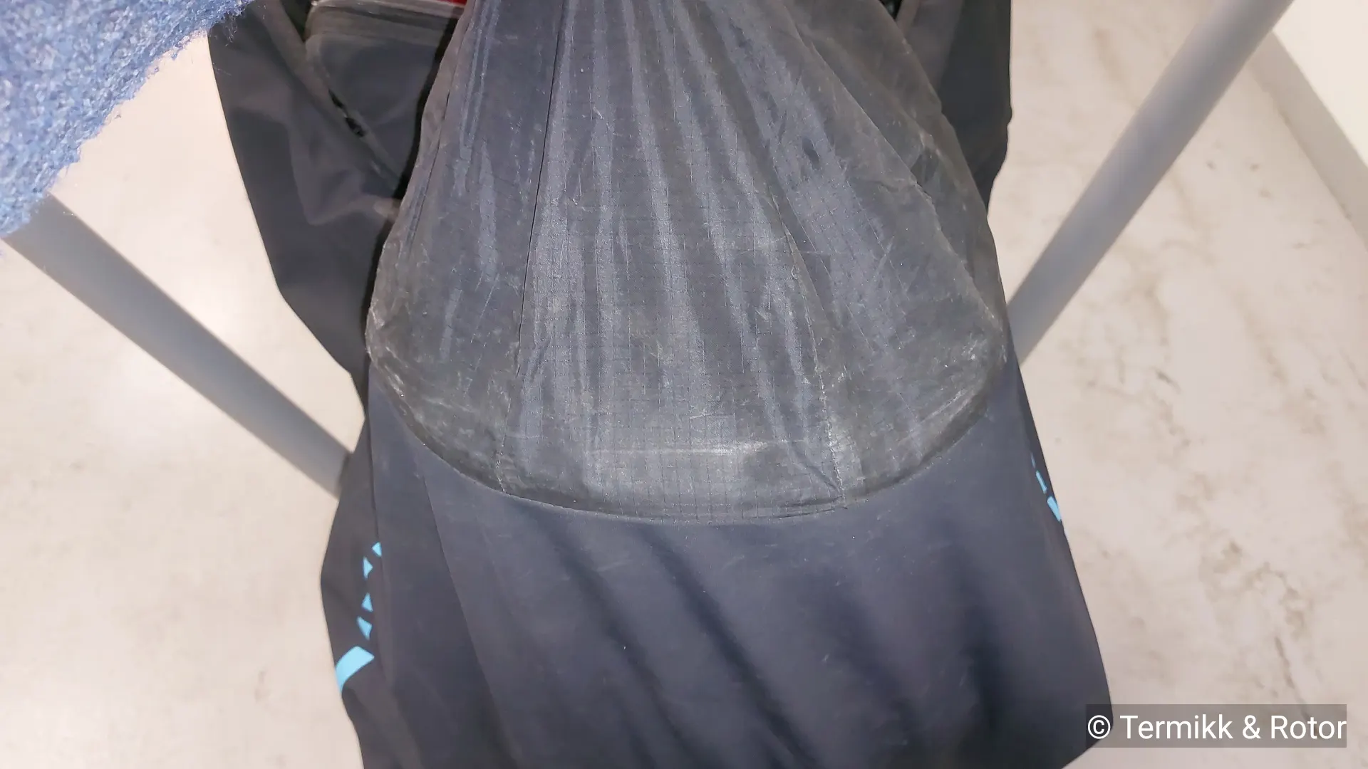 Noen små bruksmerket ved nesa, hvor den mest sannsynlig har skubbet i bakken mens man har gått med seletøyet på. Festet til nødskjermhåndtaket er modifisert. Det er også noen små flekker øverst ved ryggen.