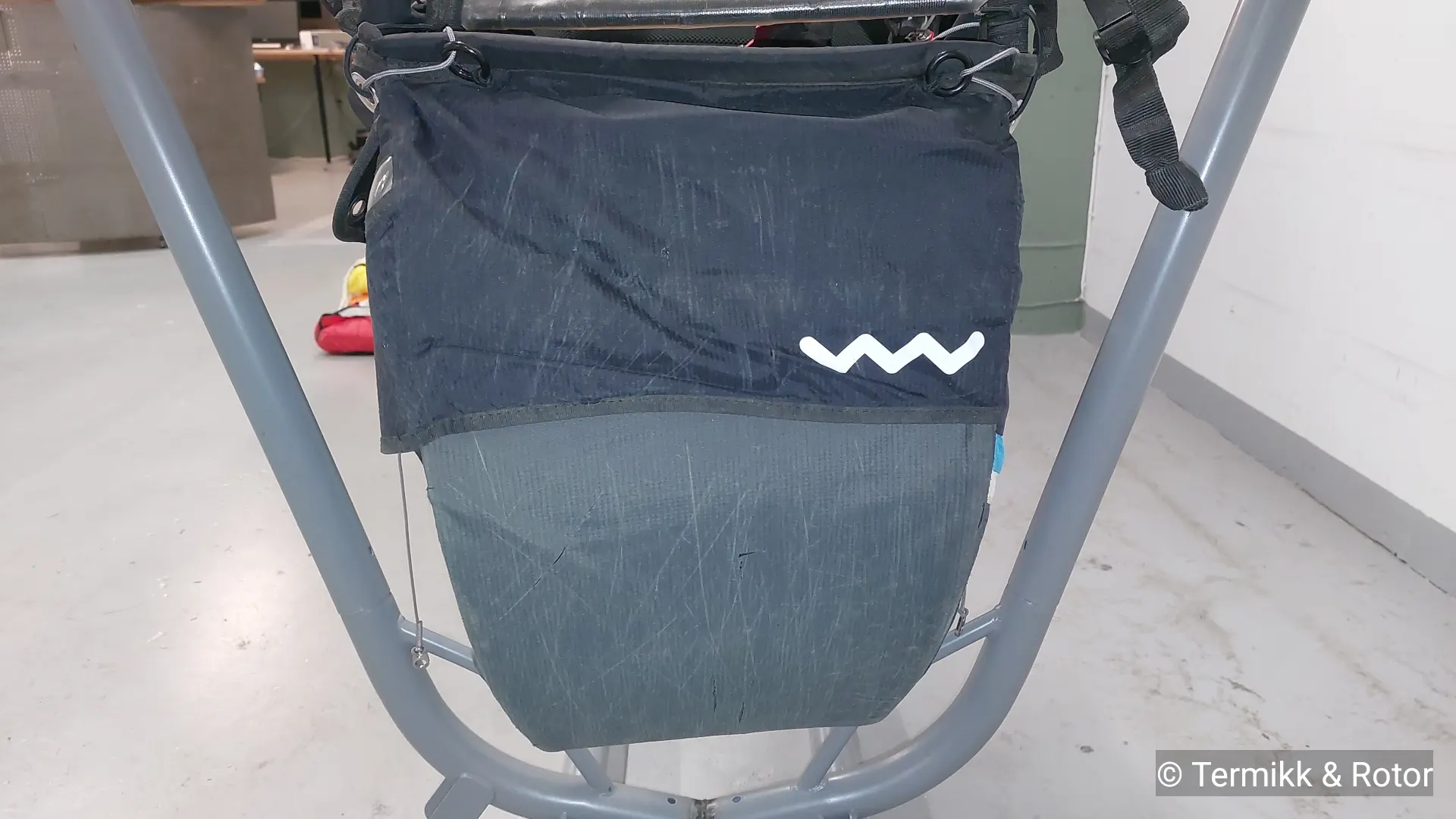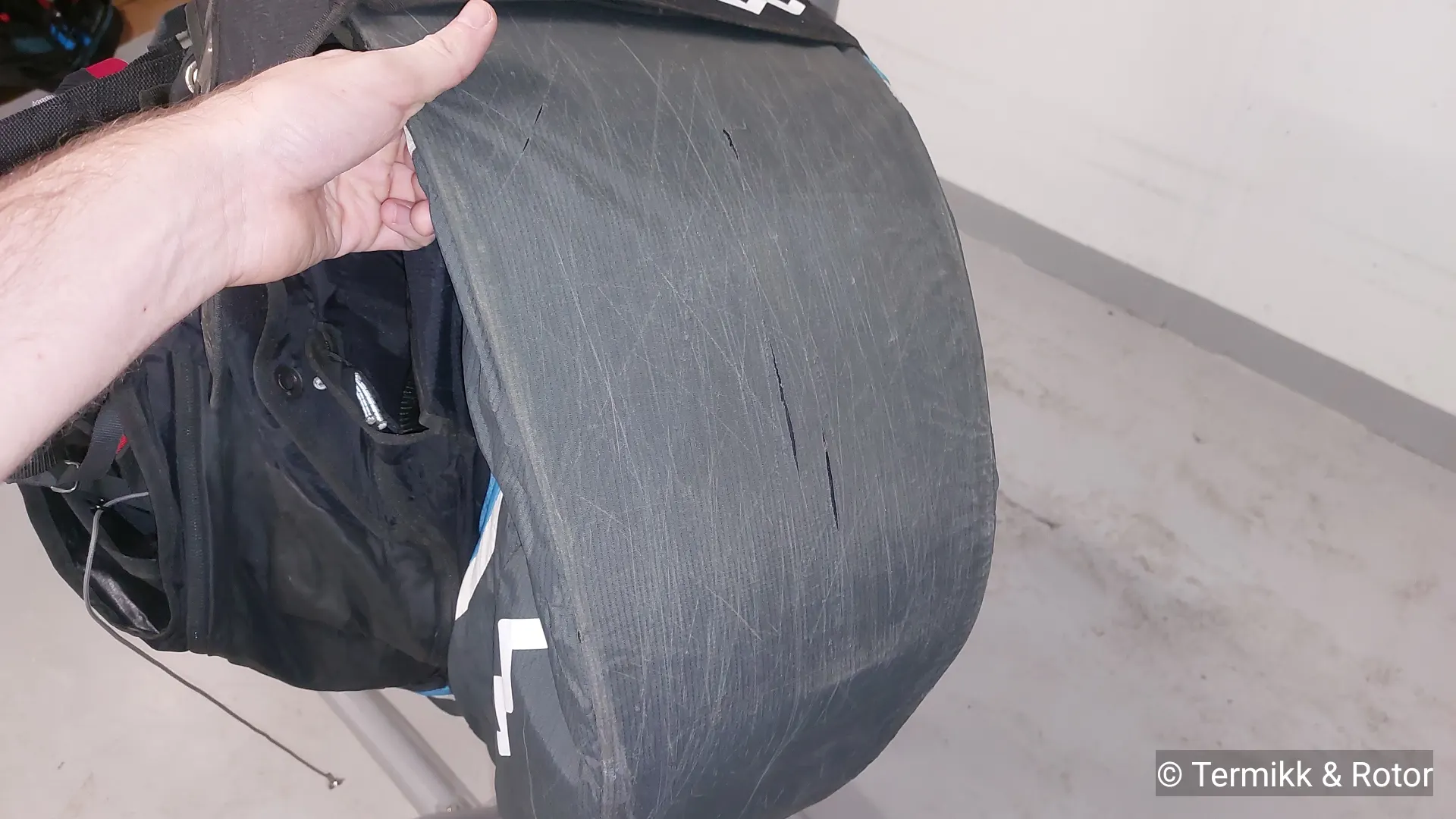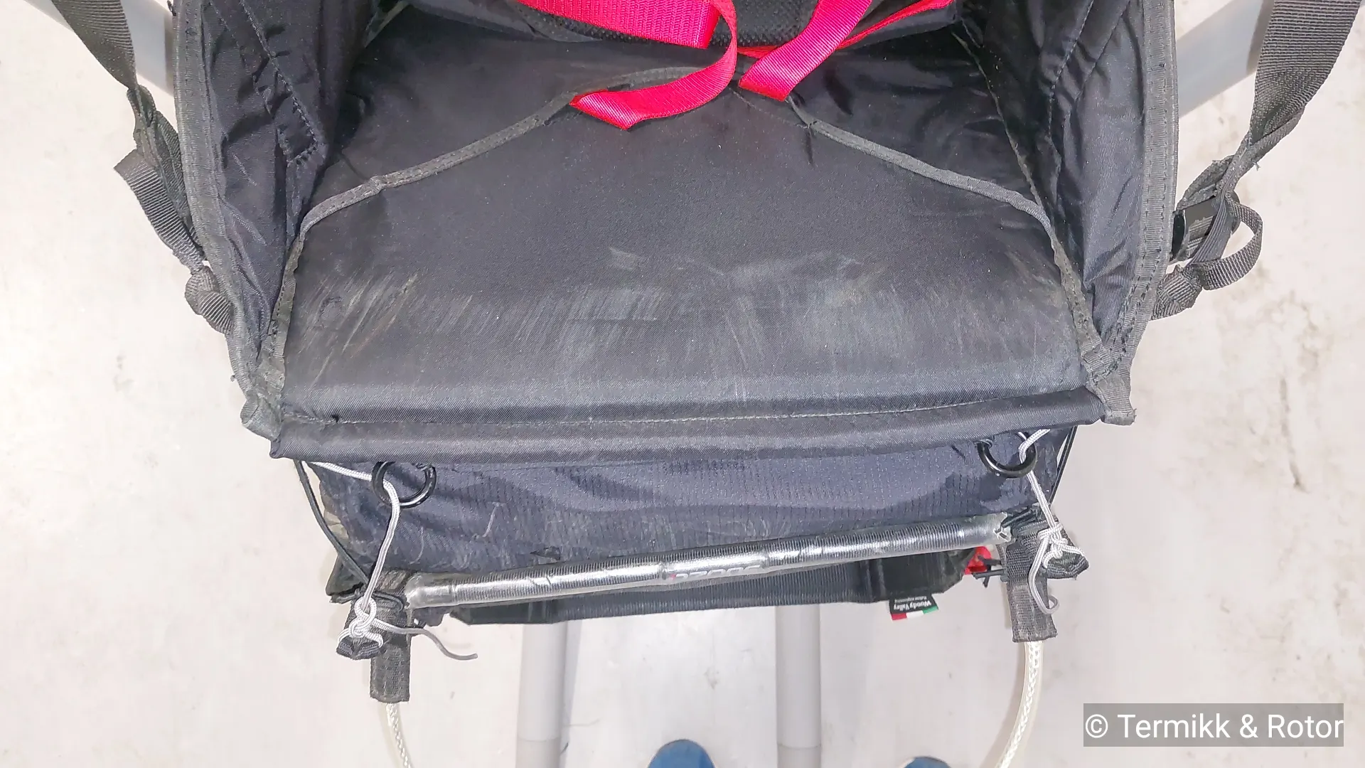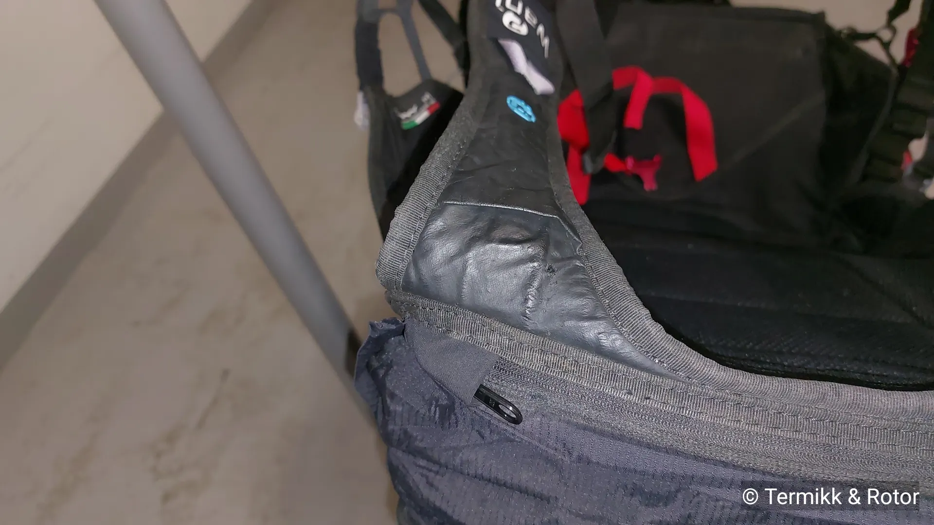 Slitasje på kanten ved setet. Slitasje på stoffet ved nødskjermåpningen og slitasje gjennom stoffet under stumpen. Når airbagen komprimeres slipper den litt luft ut gjennom sprekkene, men den fungerer fremdeles slik den skal. Slitasje på venstre skulderreim.