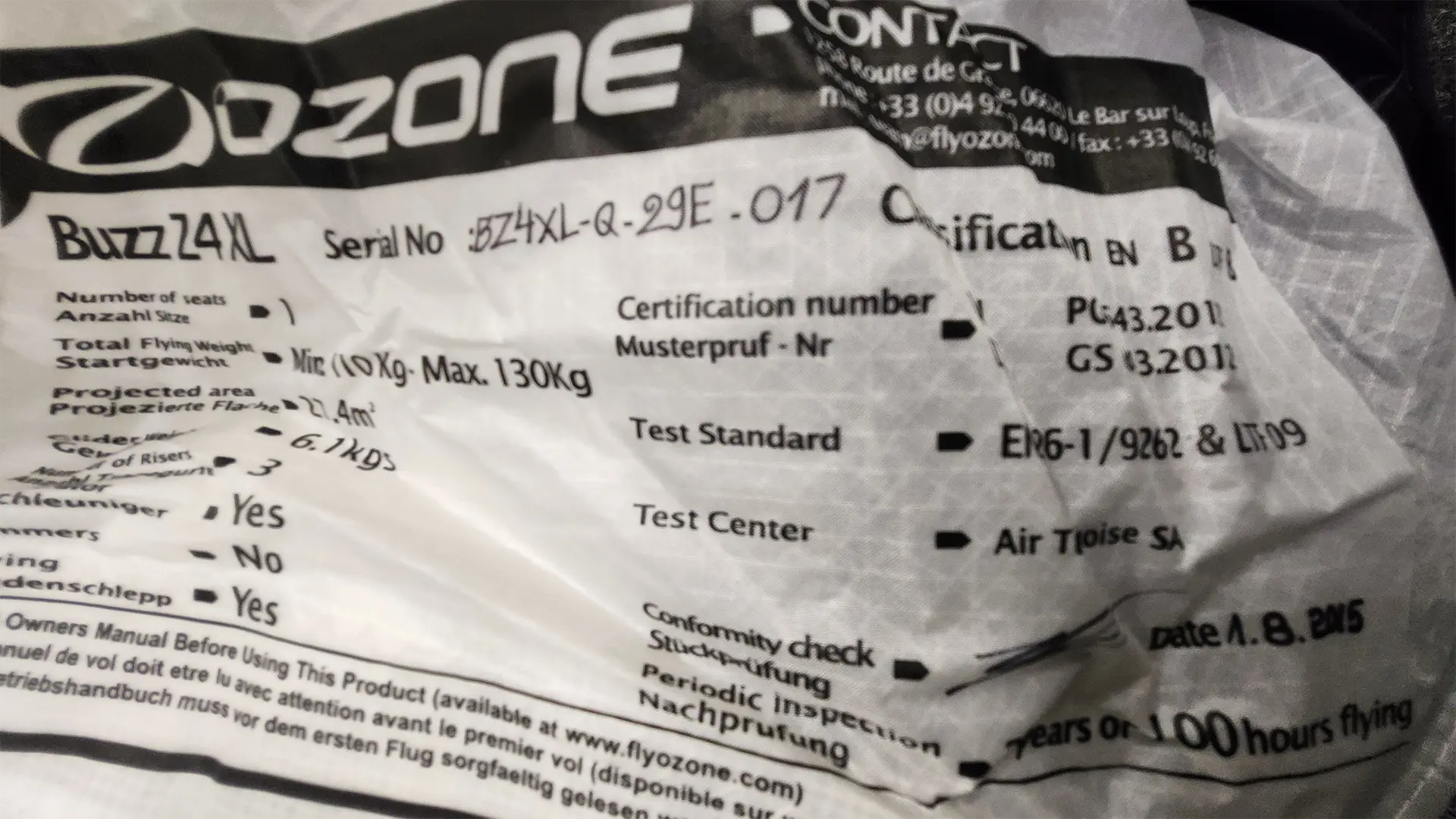 Det er oppgitt at vingens linesett er brukt i 9 timer, har en forventet restlevetid på 241 timer. Nytt linesett til denne vingen koster 4.300,00.