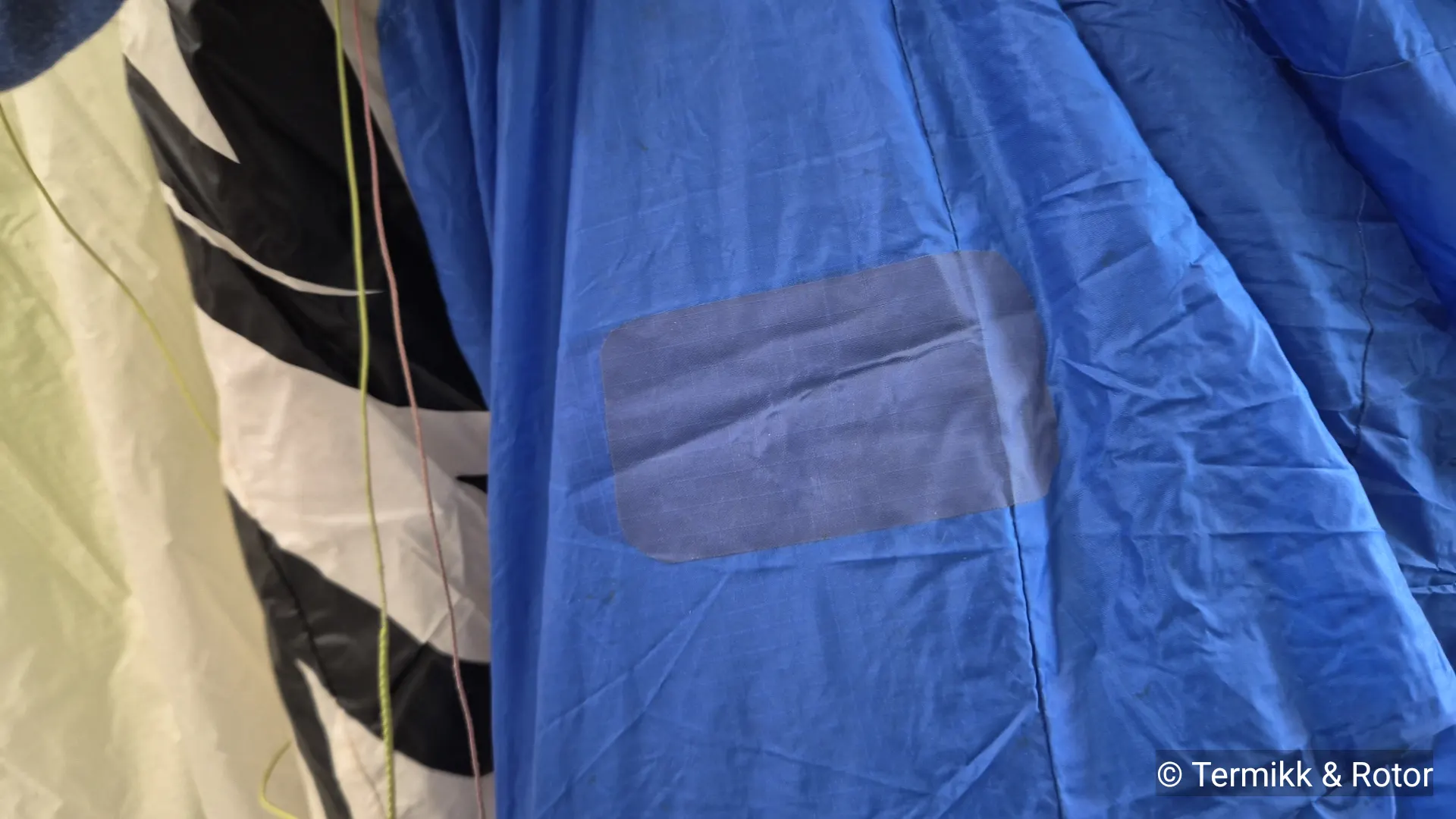 Fronten har vært i bakken og mange celler er slitt på toppduk over spilene. Hull tapet med rippstopp toppduk front høyre side