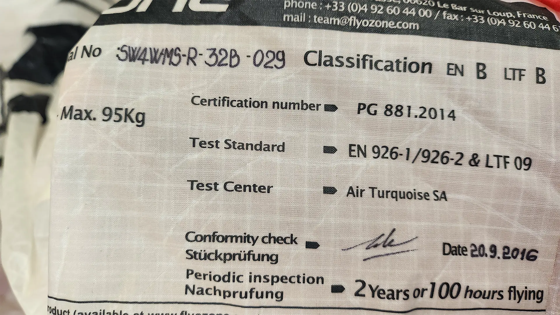 Det er oppgitt at vingens linesett er brukt i 110 timer, har en forventet restlevetid på 140 timer. Nytt linesett til denne vingen koster 2.500,00.